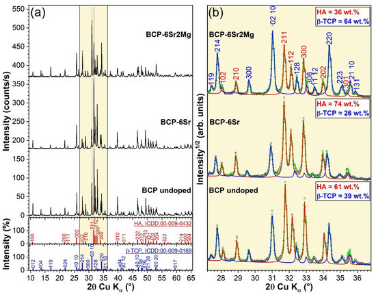 Furthermore, a noteworthy shift of the β-TCP peaks of BCP-6Sr towards lower angles was noticed (Figure 4b) with respect to undoped BCP. The incorporation of ~2 mol% Mg (i.e., BCP-6Sr2Mg samples) resulted in the return of the β-TCP peaks closer to the reference positions. The HA peaks of both the simple- and double-doped BCP samples elicited a low-angle shift similar to the one recorded in the case of the β-TCP counterpart of BCP-6Sr.