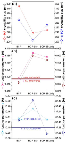 The Sr single doping increased the a- and c-lattice constants of both HA and β-TCP constituent phases (Figure 5b,c). The c-parameter was much more sensitive to the cation substitution in the case of the β-TCP counterpart. The unit cell expansion is explained by the partial substitution of Ca2+ ions with larger Sr2+ ions.