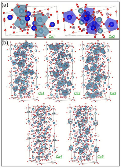 The unit cell of (a) HA (hexagonal, space group P63/m, a = b = 9.43 Å, c = 6.88 Å), emphasizing the two types of Ca sites displayed with their coordination polyhedra, and (b) β-TCP (rhombohedral, space group R3cH, a = b = 10.43 Å, c = 37.40 Å) highlighting the five types of Ca sites displayed with their coordination polyhedra. Note: The graphical representations were generated using the VESTA software (https://jp-minerals.org/vesta/en/download.html (accessed on 12 July 2022)).