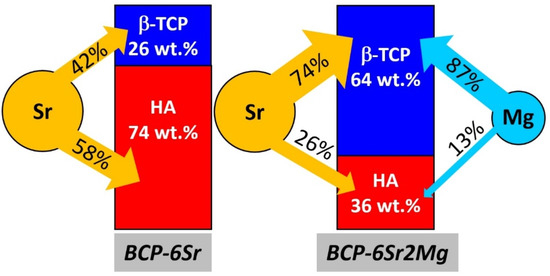 Similarly, one can obtain that in the case of BCP-6Sr2Mg, 26% of total Sr and 13% of total Mg entered HA which contains 37% of total Ca atoms, while the rest of 74% Sr and 87% Mg was incorporated into β-TCP, which contains 63% of total Ca (Figure 7). Therefore, when there was a competition between Sr and Mg to substitute Ca in a mixture of HA and β-TCP, the affinity of Sr for HA was almost as in the case of BCP-6Sr, of 26/37 = 0.7, while the one for β-TCP was diminished to 74/63 = 1.2 (Figure 7). Mg had an affinity of 14/37 = 0.4 for HA, and of 87/63 = 1.4 for β-TCP (Figure 7).