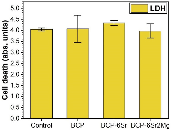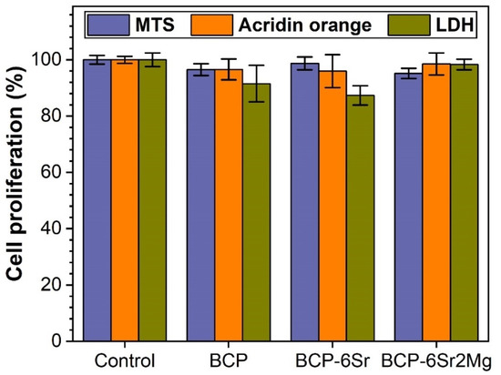 When working with a cell culture, such as hFOBs, that is not terminally differentiated, for long culturing times, some cells can undergo differentiation in contact with certain materials, leading to a heterogeneous cell population. Since differentiated and undifferentiated cells have different organelle numbers and capacities for differentiation, errors could arise when using a single type of proliferation assay. Thus, in order to gauge more accurately the cell proliferation induced by the BCP-based scaffolds, we decided to employ three different approaches: (i) a usual MTS assay, (ii) an LDH test, and (iii) an acridine orange (AO) approach. (i) In the MTS assay, the proliferation of cells is estimated indirectly by measuring the cell enzymatic capacity to transform MTS into the blue formazan product. Some conditions can interfere with the test and induce a difference between the real proliferation and the one calculated by the total metabolic capacity of producing formazan. For instance, the presence of specific metallic ions leached from the material could alter the cellular metabolic processes and induce errors in cell proliferation estimation. (ii) LDH, an intracellular enzyme, quite resilient to inactivation, being mostly used to determine cell death by investigating its quantity leaked from dead cells in the growing medium, was used as a backup verification for cell proliferation. (iii) Another venue of cell proliferation assessment was the use of acridine orange, a fluorescent chemical that enters cells and bind to nucleic acids such as DNA and RNA. The AO assay, in contrast with the two previously mentioned ones, which infer protein activity, measures another type of cellular class of substances, i.e., the nucleic acids. By collective assessment, the information provided by these three independent tests was believed to foster a more relevant and complete image of cell proliferation, with smaller room for errors.