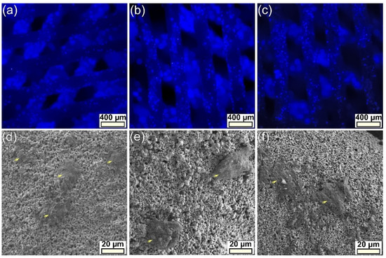 The MTS tests indicated slightly smaller cell proliferation values for the BCP-based scaffolds with respect to the cell adhesive polycarbonate control surface (see Figure 8). This constituted a first indication of the good cytocompatibility of the robocasting-printed scaffolds. The marginally smaller values obtained on scaffolds (i.e., 95.1–98.7% vs. 100% for adherent cell culture dedicated polycarbonate, p < 0.05) could arise from the adsorption of small quantities of formazan product on the surface of the BCP-based ceramics.
