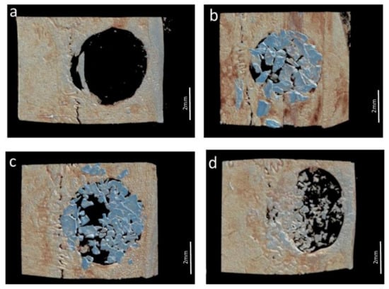 Micro-CT analysis—three-dimensional reconstructions of the defects. (a) Control Group; (b) Porcine Group; (c) Bio-Oss Group; (d) Bonefill Group.