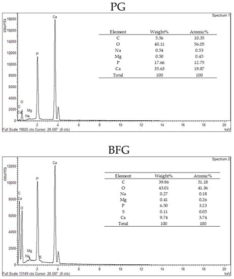 The grafts used in the PG and BFG groups were structurally and chemically characterized. To identify and characterize the elemental composition present on the grafts, energy dispersive X-ray spectroscopy (EDS) measurements were performed using an INCAx-Sight System; (Oxford Instruments, Abingdon, UK) at a 15 kV voltage, spot 5.0, and a working distance of 10 mm (Figure 3). The PG presented higher percentages (both in weight and atomic composition) of Ca (35.36% in weight) and P (17.66% in weight) when compared to the BFG (Ca = 9.74%; p = 6.50% in weight). The PG also presented lower percentages of C (5.56% in weight and 10.35% in atomic) in comparison to the BFG (39.96% in weight and 51.18% in atomic).