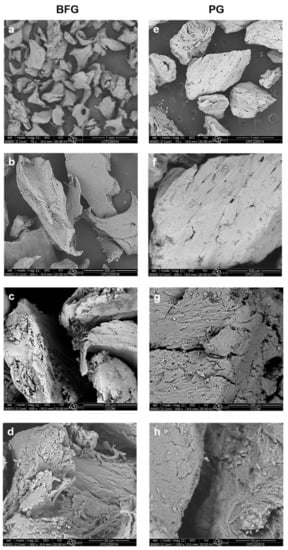 High-resolution scanning electron micrographs of the BFG (a–d) and PG (e–h) showing ultrastructural surface characteristics of the biomaterials, with a magnification of 70× (a,e), 200× (b,f), 500× (c,g), and 1500× (d,h).