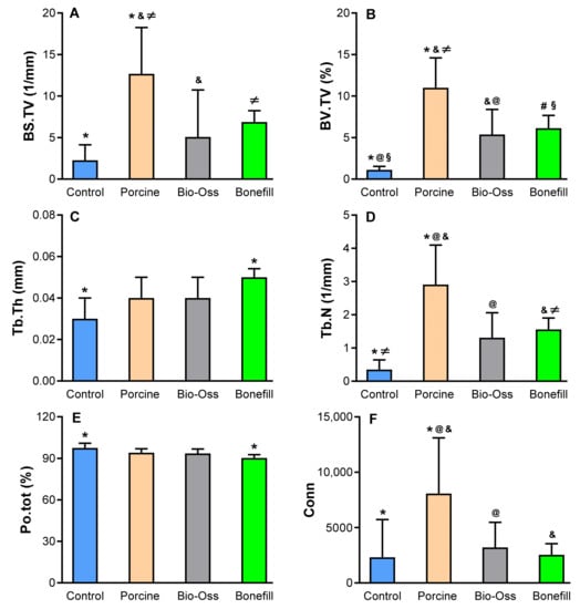 Micro-CT results of the critical size defects in rat calvaria: mean and standard deviations (SD) of bone surface density (A) (BS/TV, 1/mm); bone volume percentage (B) (BV/TV, %); trabecular thickness (C) (Tb.Th, mm); number of trabeculae (D) (Tb.N, 1/mm); total porosity (E) (Po.tot, %); bone connectivity (F) (Conn) for each experimental group. Equal symbols indicate statistically significant differences between groups (p < 0.05): * = Control versus Porcine; @ = Control versus Bio Oss; § = Control versus Bonefill; & = Porcine versus Bio Oss; # Porcine versus Bonefill.