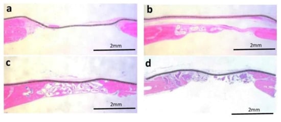 Panoramic histological images of all experimental groups at 1.6× magnification, stained with hematoxylin and eosin (H.E): (a) Control Group; (b) Porcine Group; (c) Bio-Oss group; (d) Bonefill Group.