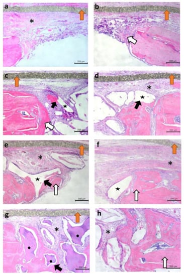 Histological images of the experimental groups at 10× magnification. Slides stained with hematoxylin and eosin (H.E.). (a,b) Edges of the defect in the Control Group; (c,d) The Porcine Group defect; (e,f) Edges of the defect in the Bio-Oss group; (g,h) Edges of the defect in Bonefill group. Black arrows: Direct contact between the biomaterial particles and the newly formed bone. White arrows: Bone tissue. Orange arrows: PTFE membrane. Black Stars: Remaining particles of the biomaterial. Asterisks: Area of nonmineralized fibrous tissue.