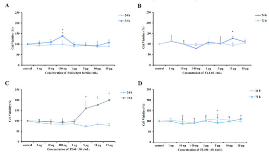 The percentages of cell viability were evaluated after cells were cultured with full-length or fragments of fortilin. At concentrations ranging from 1 ng/mL–15 µg/mL, recombinant fortilin was not cytotoxic to the cells after treatment for 24 and 72 h (Figure 2A–D). Furthermore, fortilins at given concentrations promoted cell proliferation (Figure 2A,C). Full-length fortilin at a concentration of 100 ng/mL significantly enhanced cell viability at 72 h of treatment (p < 0.05) (Figure 2A), whereas FL61-100 at concentrations ranging from 5–15 µg/mL promoted cell proliferation after treatment for 72 h in a dose-dependent manner (Figure 2C). Full-length fortilin at concentration of 10 ng/mL was used for further experiments since this was the minimal concentration that promoted cell proliferation.