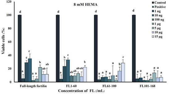 The anticytotoxicity effect of recombinant fortilin and truncated fragments on HEMA-induced cytotoxicity in hDPSCs. Data were expressed as means ± standard deviation (n = 4). Different letters represent significance at p < 0.01 (one-way ANOVA with Tukey’s multiple comparison test).