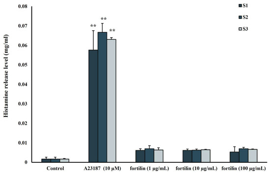 The histamine release level. PBMCs from three subjects designated as S1, S2, and S3, were incubated with 1, 10 and 100 µg/mL of full-length fortilin and calcium ionophore A23187 (10 µM) as a positive control. Data were expressed as means ± standard deviation (n = 3). ** represents p < 0.01 (one-way ANOVA with Tukey’s multiple comparison test).