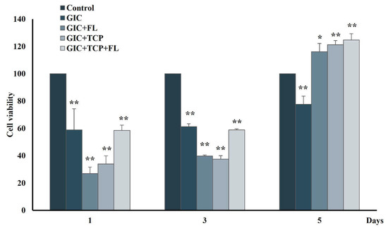 All groups showed reduced cell viability after being treated with GIC specimens for 1 and 3 days. However, the cell viability in all modified GICs was significantly higher than control on day 5 (Figure 6).