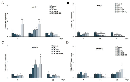 To investigate the effect of modified GICs on the differentiation of hDPSCs, the expression of odontogenic differentiation markers was examined by qRT-PCR. In the GIC + TCP + FL group, the mRNA expression of ALP was significantly up-regulated on days 7 and 14 by more than twofold (p < 0.01) (Figure 7A), whereas the DSPP and DMP-1 expressions were up-regulated on day 14 and day 21 (p < 0.05), respectively (Figure 7C,D). The OPN expression showed significantly decreased level on days 14 and 21 in all groups (Figure 7B).