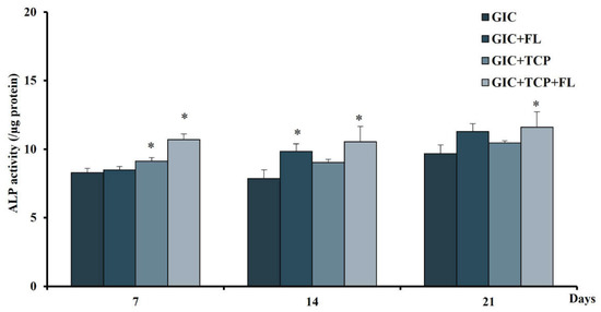 To evaluate the effect of modified GICs on cell differentiation, the ALP activity was measured after culturing hDPSCs on the GIC specimens for 7, 14 and 21 days. Alkaline phosphatase activity significantly increased in the GIC + TCP + FL group at all time points investigated, whereas the GIC + TCP and GIC + FL groups showed increased levels of ALP activity at days 7 and 14, respectively (p < 0.05) (Figure 8).
