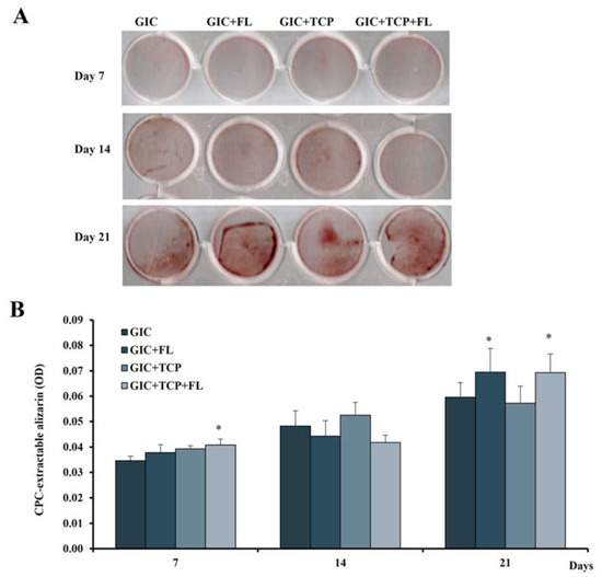 Calcium deposition in hDPSCs cultured with modified GICs for 7, 14 and 21 days was investigated by ARS assay (Figure 9A). All modified GICs showed no difference in calcium deposition on day 14, whereas the GIC+ FL and GIC + TCP + FL groups significantly enhanced the mineralization on day 21 (p < 0.05) (Figure 9B).