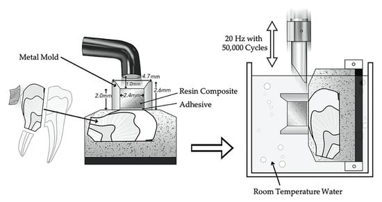 Schematic illustration of experimental setup for shear fatigue bond strength. This schematic is modified from open access [19], original © Operative Dentistry, Inc.