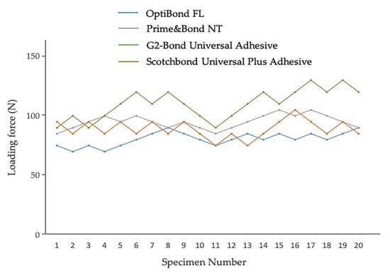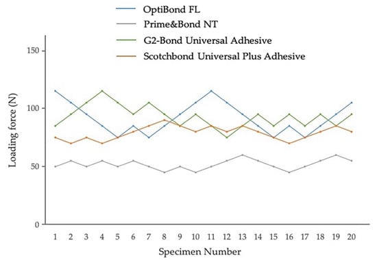 The experimental set-up is shown in Figure 1. Fatigue bond strength test results using the staircase method for etch-and-rinse mode to enamel and dentin are shown in Figure 2 and Figure 3. The incrementally adjusted (circa 10%) loading force can be seen. The fatigue bond strengths of all the tested adhesive systems in etch-and-rinse mode are shown in Table 2. The fatigue bond strengths were 17.8 MPa to enamel and 20.4 MPa to dentin for OptiBond FL, 21.0 MPa to enamel and 11.4 MPa to dentin for Prime&Bond NT, 24.6 MPa to enamel and 20.7 MPa to dentin for G2-Bond Universal (etch-and-rinse mode), and 19.7 MPa to enamel and 17.5 MPa to dentin for Scotchbond Universal Plus (etch-and-rinse mode).