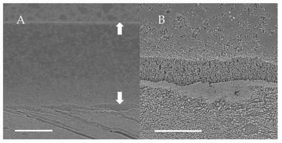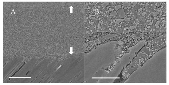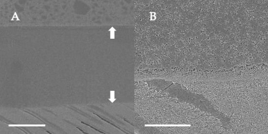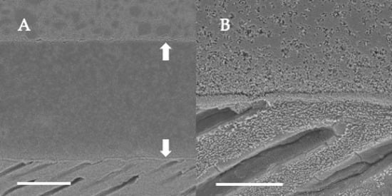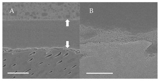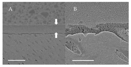 SEM observation of adhesive interface for G2-Bond Universal to dentin. (A): ×1000, scale indicates 20 µm. Arrows indicate the adhesive layer; (B): ×5000, scale indicates 5 µm.