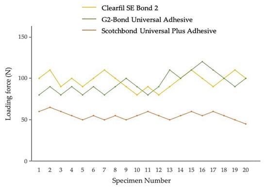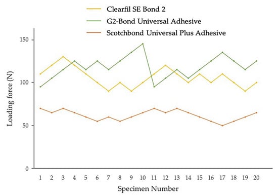 Dentin fatigue bond strength loading force results using the staircase method for adhesives in self-etch mode. The loading forces for 1st specimens were determined by the results of average shear bond strength value [Clearfil SE Bond 2: 49 MPa; G2-Bond Universal (self-etch mode): 43 MPa; Scotchbond Universal Plus Adhesive (self-etch mode): 31 MPa]. The average values were the numbers truncating the numbers beyond the first decimal point.