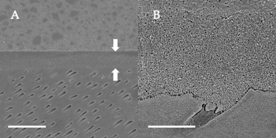 SEM observation of adhesive interface for Clearfil SE Bond 2 to dentin. (A) ×1000, scale indicates 20 µm. Arrows indicate the adhesive layer; (B) ×5000, scale indicates 5 µm.