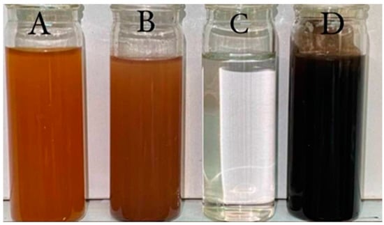 Showing color changing. (A) FeCl2 and FeCl3, (B) change color after stirring, (C) NH4OH added to the mixture then change the color to black as show in (D) synthesized Fe3O4 NPs solution.