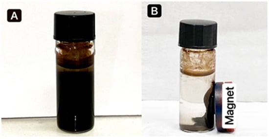 (A) Iron oxide nanoparticles (Fe3O4) without an external magnet, and (B) separated Fe3O4 NPs using an external magnet.