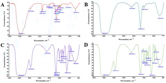 FTIR spectra analysis of (A) Fe3O4 NPs, (B) Fe3O4 NPs+PEG, (C) Fe3O4 NPs+Gen, and (D) Fe3O4 NPs+PEG+Gen.