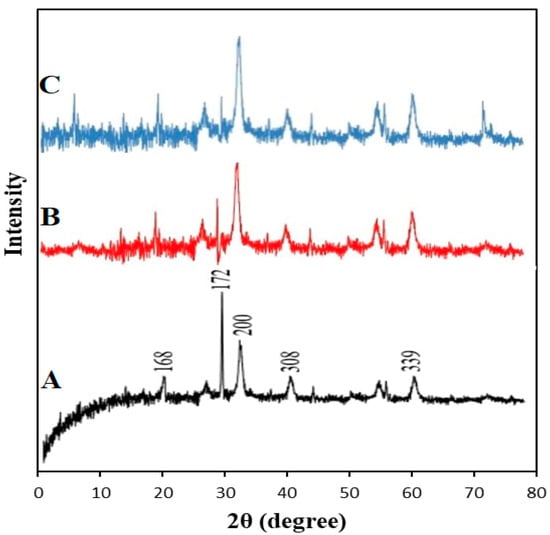 XRD patterns of (A) Fe3O4 NPs, (B) Fe3O4 NPs+PEG, and (C) Fe3O4 NPs+PEG+Gen.