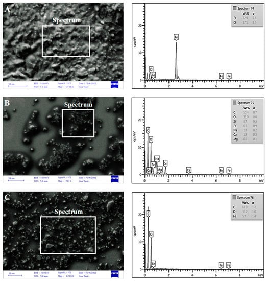 SEM images and EDX of (A) Fe3O4 NPs, (B) Fe3O4 NPs+PEG, and (C) Fe3O4 NPs+PEG+Gen.