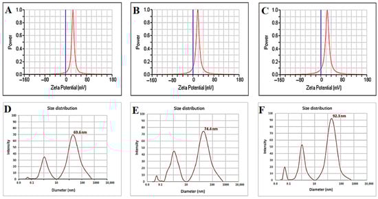Zeta potential and dynamic light scattering (DLS) of (A,D) Fe3O4 NPs, (B,E) Fe3O4 NPs+PEG, and (C,F) Fe3O4 NPs+PEG+Gen, respectively.