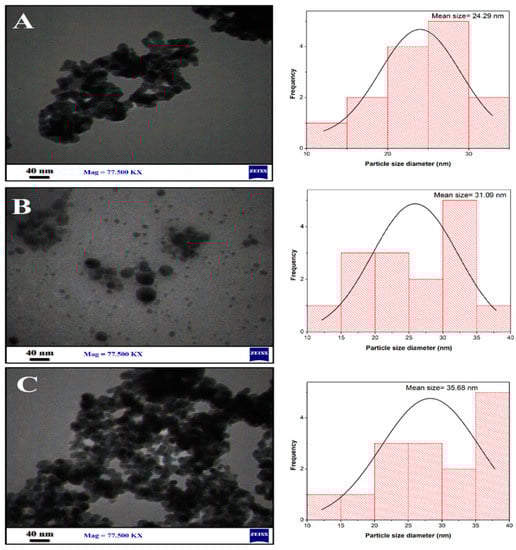Figure 7 shows the TEM images and particle size distribution of Fe3O4 NPs, Fe3O4 NPs+PEG, and Fe3O4 NPs+PEG+Gen. The image J software was utilized to measure the average mean size of nanoparticles. The obtained Fe3O4 nanoparticles have a clear and spherical shape with an average size of 24.29 nm, as shown in Figure 7A. Figure 7B shows the addition of PEG, which acts as a stability enhancer and dispersing agent. Moreover, the addition of PEG decreased the agglomeration because PEG modified the surface of Fe3O4 NPs so that the particle is more monodisperse and uniform, with an average size of 31.09 nm, as seen in Figure 7B. Coating Fe3O4 nanoparticles with PEG reduced the magnetic interaction between the particles due to their lower magnetism and prevented agglomeration [55]. In addition, Figure 7C shows the TEM images of Gen loaded on the Fe3O4 NPs+PEG, with an average size of 35.68 nm. The shrinkage in the size when the drug (Gen) was loaded on the nanoparticles could be attributed to the lattice strain generated due to the large Gen molecules, that prevented the nucleation and growth of the Fe3O4 during the reaction [56].