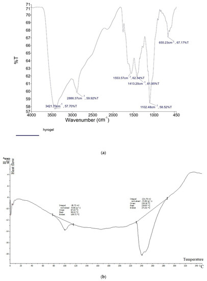 The Fourier transform infrared spectroscopy (FTIR) study was carried out at a wavelength range of 4000-450 cm−1 using a spectrometer (PerkinElmer, Waltham, MA, USA). The thermal behavior of hydrogel was characterized by differential scanning calorimetry (DSC, Mettler Toledo, Columbus, OH, USA) at the temperature range between 20 and 350 °C at a heating rate of 10 °C min−1.