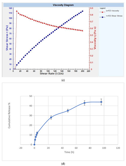 The determination of viscosity of 3% (w/v) chitosan hydrogel containing folinic acid was measured using a Brookfield R/S+ Rheometer (Brookfield, Middlebro, MA, USA) with SC4-25 spindle at a shear rate of 0–200 s−1.