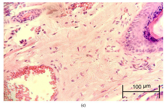 To investigate the degree of inflammation, the inflammatory cells, including neutrophils, macrophages, plasma cells, and lymphocytes were counted three times, at 400× magnification with a microscope (Nikon-Eclipse-E100, Minato, Japan). Moreover, the number of fibroblasts and fibrocytes was counted to analyze the rate of granulation tissue formation and maturation of the healing area. Vascular proliferation was measured at 400× to evaluate the extent of angiogenesis in the study groups. In Masson’s trichrome staining, the amount of mature collagen with a deep blue color and new collagen with a light blue color was analyzed using the same scoring of hematoxylin and eosin staining.