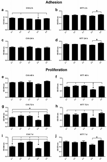 Adhesion and proliferation of hFOBs grown on Ti6Al4V surfaces at different time points (n = 5 for each time point). Crystal violet assays (CVA) (a,c,e,g,i) and MTT assays (b,d,f,h,j). Significant differences between the test groups are characterized by asterisks (*). OD-values are depicted as mean ± SEM.