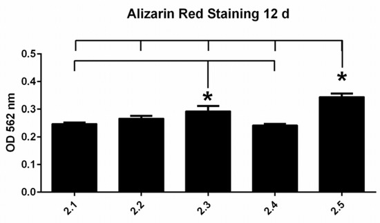 Biomineralization as evaluated by Alizarin Red staining after 12 days (n = 5). OD values represent arbitrary units. Significant differences between the groups are indicated with asterisks (*). OD values are depicted as mean ± SEM.