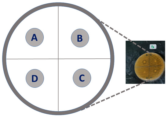 Antibacterial tests were carried out using the following equipment: a pipette to collect bacteria, a test tube for liquid brain heart infusion (BHI), a sterile loop to apply bacteria, disks, a refrigerated centrifuge (Eppendorf 5417 R, Hamburg, Germany), laminar flow (Labonco Co, Kansas City, MO, USA), an incubator (Sanyo MIR 162, Osaka, Japan), an autoclave for Tryptone Soya Agar (TSA) sterilization, a digital caliper to measure the TSA radical zone, and a lamp.