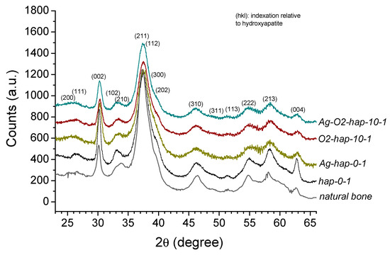 XRD patterns for selected peroxide and/or silver-doped and undoped apatites, compared to natural bone (rat, nine months old, CIRIMAT internal specimen). The main (khl) diffraction lines corresponding to the hydroxyapatite phase (PDF file #00-009-0432) are also annotated.