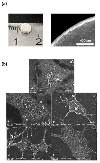 Observation of compacted apatite pellets: (a) Typical example of produced pellet: optical microscopy (left) and SEM (right) for the Ag-O2-hap sample); (b) adhered MC3T3E1 osteoblast cells on apatite pellets, where A is cell control, B is Ag-hap, C is O2-hap, D is Ag-O2-hap, and E is hap as reference.