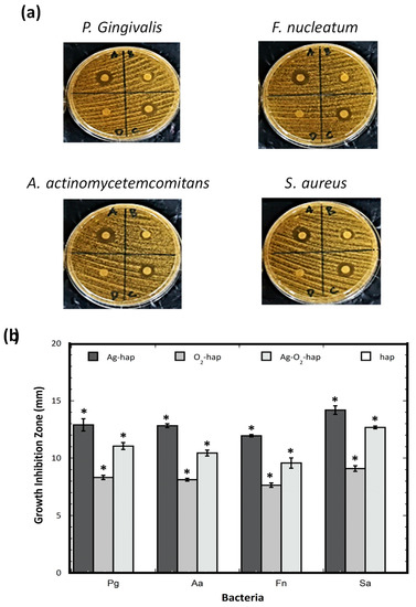 (a) Results of antibacterial tests with P. gingivalis (Pg), A. actinomycetemcomitans (Aa), F. nucleatum (Fn), and S. aureus (Sa) for (b) all four types of apatite samples: (A) Ag-hap, (B) O2-doped, (C) Ag-O2-hap, and (D) hap. The asterisk * shows statistically significant differences. The statistical ANOVA analysis is given in Tables S1 to S5 as supporting information .
