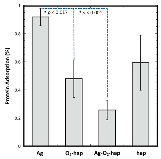 In the present work, the level of protein adsorption reached for each type of apatite samples after contact with Fetal Bovine Serum (FBS) was quantified via a differential approach by UV spectrophotometry (see experimental data for details). Figure 6 shows the results obtained, and the numerical values from the ANOVA analysis are reported in Table S6. Peroxidated apatite O2-hap showed a similar adsorption level compared to undoped apatite, as no significant difference was found between Ag-hap and hap (p = 0.084), thus not modifying significantly surface interaction with circulating proteins. Samples involving silver showed however different behaviors. Indeed, there were significant differences on the protein adsorption between Ag-doped with Peroxide-doped (p < 0.017) and between Ag-doped with Ag-Peroxide-doped (p < 0.001). This led to the following order: Ag-hap > O2-hap ≅ hap > Ag-O2-hap. The presence of Ag+ ions thus seems to affect proteins’ interaction with the sample surfaces. Ag-for-Ca substitution could generate modifications of the surface features such as the surface charge, although in a way that varies depending on the copresence of peroxide ions or not. Although signs of secondary phases were not seen by XRD nor FTIR for the co-doped Ag-O2-hap sample, the simultaneous presence of Ag+ and O22− (oxidizing) ions may have led to the combination of these ions to some extent on the surface of the apatite particles, generating silver (per)oxide, thus modifying the surface features; indeed, such phases as silver peroxide may exhibit different surface charges and ionic mobility compared to regular apatite. Furthermore, this hypothesis might explain the peculiar antibacterial behavior observed for the co-doped sample Ag-O2-hap in Figure 5 (on the basis of modified availability of Ag+ ions after immersion). We may however underline that SEM-EDX analyses performed (Figure S4) on the four types of apatite powders did not show any signs of Ag clustering (even in BSE mode), thus the possible difference of Ag+ ions environment does not appear to be explainable by abnormal silver concentration at the surface of the particles.