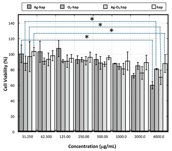 Cell viability was studied by 3-(4,5-dimethylthiazol-2-yl)-2,5-diphenyltetrazolium bromide (MTT) assay. A series of samples (hap, Ag-hap, O2-hap, and Ag-O2-hap) in solution with different concentrations of 31.25, 62.50, 125, 250, 500, 1000, 2000, and 4000 mg/mL were prepared by suspending the samples into distilled water at 60 °C temperature at 350 rpm velocity for 1 h until it turned into a homogenous suspension, which was sonicated before storage in the refrigerator.