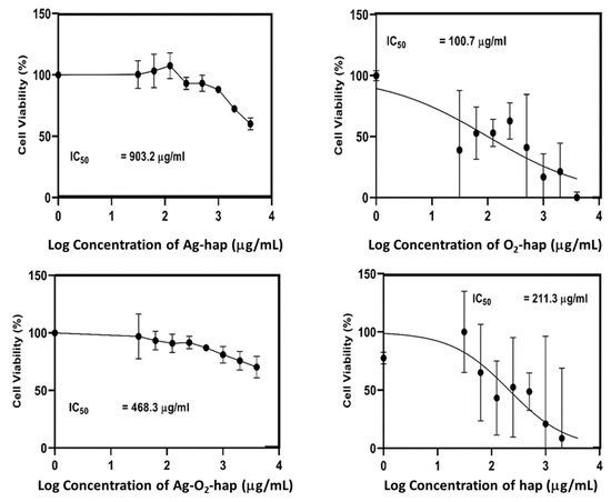 To further investigate the cytotoxicity of the doped apatite compared to the hap reference, a log dose response analysis was conducted to provide information on the half-maximal inhibitory concentration (IC50) of each sample. Results of this IC50 analysis are shown in Figure 9. The half-maximal inhibitory concentration (IC50) of the O2-hap was found to be the lowest (100.7 µg/mL). In contrast, the Ag-hap sample showed the highest IC50 (903.2 µg/mL), also compared to the other doped apatites. When the peroxide apatite was co-doped with Ag, the IC50 increased significantly to 468.3 µg/mL in comparison to the original O2-hap, pointing out a decreasing biocompatibility tendency upon Ag incorporation. As a reference, the IC50 of the hap reference reached 211.3 µg/mL, thus somewhat higher than for the safest material tested, namely O2-hap.