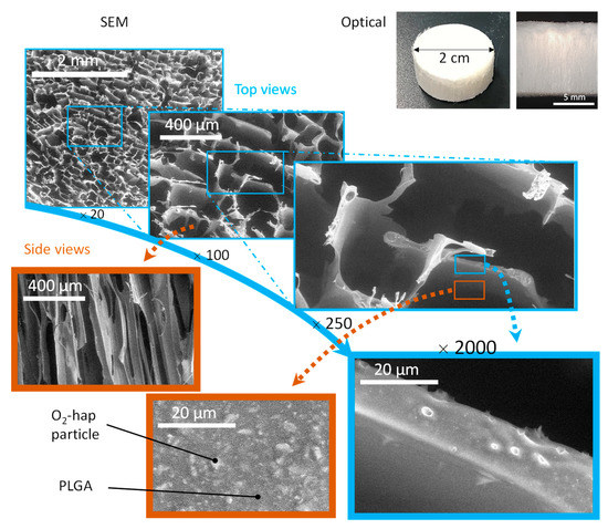 Optical (top right) and SEM observations of 3D inorganic–organic composite scaffolds obtained by freeze-casting, associating O2-hap particles with PLGA.