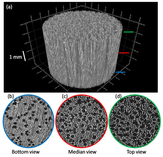 Three-dimensional µCT images (a) and µCT sections images ((b–d), labeled according to the color code of the main image) of 3D inorganic–organic composite scaffolds obtained by freeze-casting, associating O2-hap particles with PLGA.