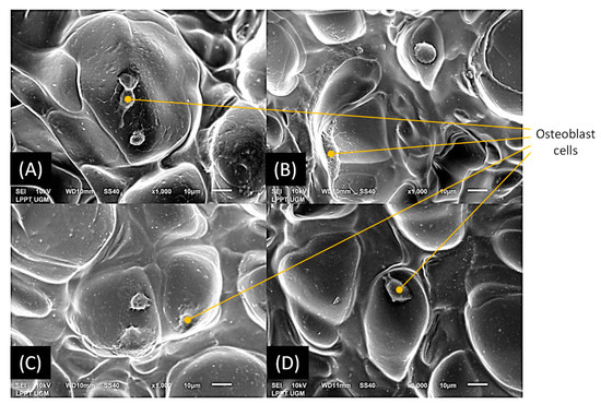 Mouse osteoblast cells (osteoblast-like cells MC3T3E1) were cultured in MEM-α medium (Gibco, CA, USA) with additional 10% FBS (Gibco, CA, USA) enriched with 2% Penicillin-Streptomycin (Gibco, CA, USA) and 0.5% Fungizone (Gibco, CA, USA). The cell suspension in 100 µL were seeded on the bottom of a 96-well plate at a density of 2 × 104 cells/well. After that, the cells were incubated for 24 h at 37 °C in 5% CO2. An amount of each 100 mL of the sample solution was added into the wells, with control (the well with cells without sample solutions). Again, the incubation was conducted for the next 24 h at 37 °C in 5% CO2 incubator.