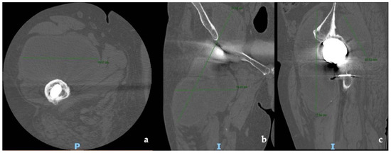 Preoperative CT scans of hip and thigh: (a) axial view; (b) coronal view; (c) sagittal view.