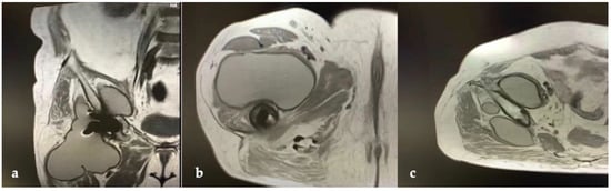 Preoperative MRI of hip and thigh: (a) coronal view; (b) axial view at femoral diaphyseal level; (c) axial view at acetabular level.