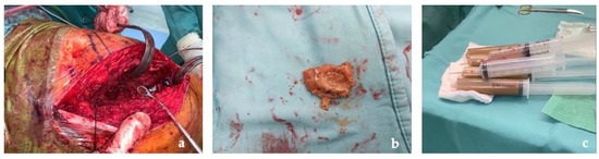 Intraoperative images: (a) pseudotumor identification at articular level; (b) pseudotumor capsule taken for histological exams; (c) fluid drained from the pseudotumor.