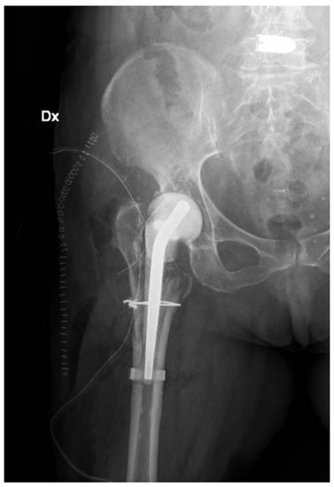Radiographs, CT scans, and an MRI of the right hip and femur were required. The hip X-rays showed the components in a proper position with no evidence of loosening and periprosthetic fractures (Figure 1).